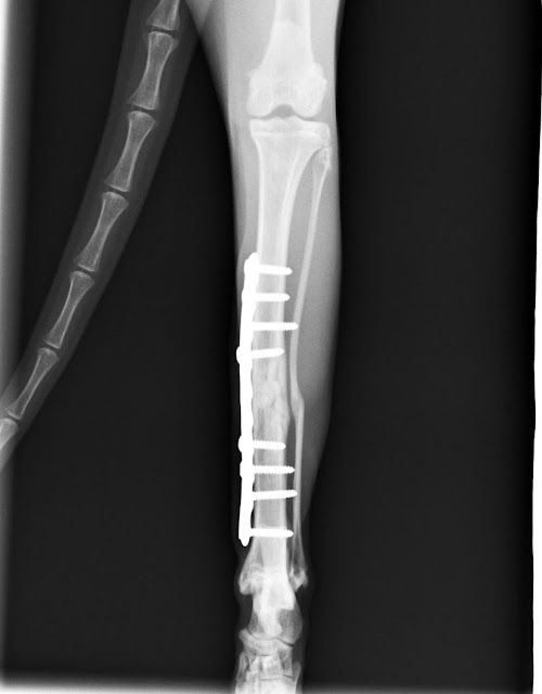 They never watching him do flips in that kennel, and drag himself around the litter box, squeezed between it and the walls of the kennel with a catnip toy clutched in his mouth, with me cringing as I could see in my mind's eye that leg getting twisted and bent in all that frenetic play. But it never did. He jumped around, kicked at toys, scratched his ear (as soon as the splint was off) with that foot, and had been weight bearing on that leg from day one after surgery. What did happen was he kept his muscles in good condition.